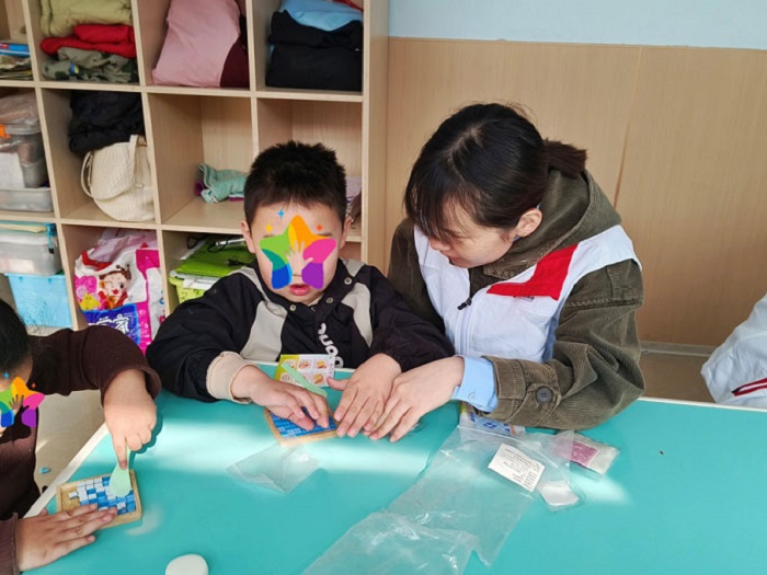 “手工DIY杯垫”制作在轻松愉快的氛围中展开。志愿者们与孩子们结对而坐,桌上五彩的马赛克颗粒、晶莹的填缝剂和各种制作工具,瞬间点燃了大家的创作热情。起初,一些孩子显得有些拘谨,但在志愿者们耐心、温和的引导和鼓励下,他们渐渐放下了防备,开始挑选自己喜欢的颜色和图案,专注地投入到创作中。