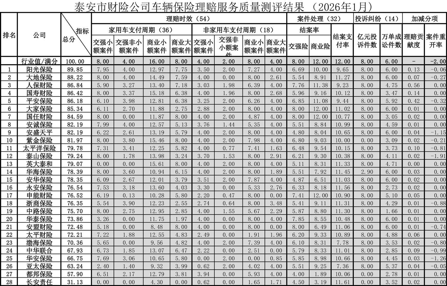 泰安市财险公司车辆保险理赔服务质量测评结果公示(2026年1月)