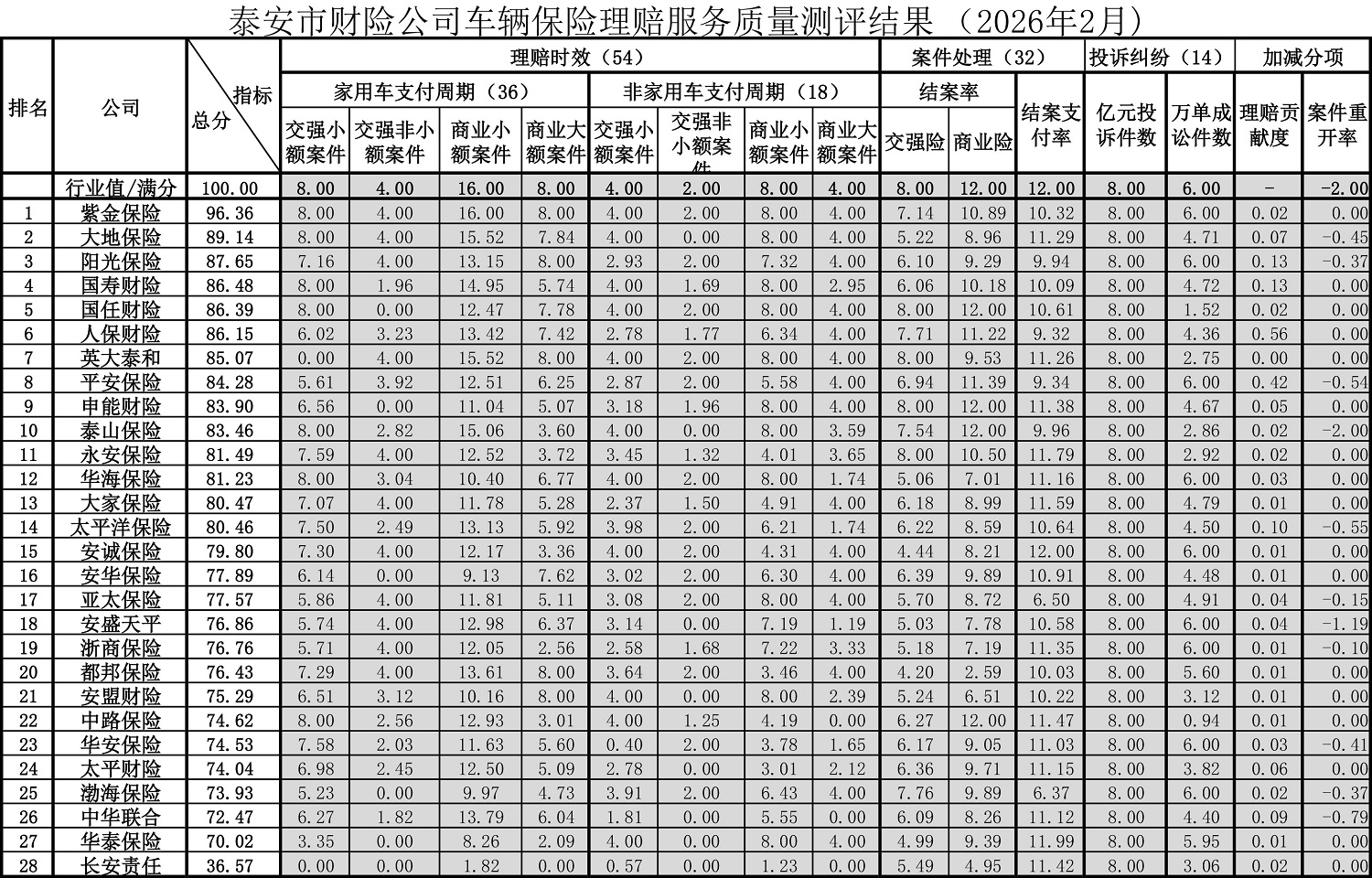 泰安市财险公司车辆保险理赔服务质量测评结果(2026年2月)