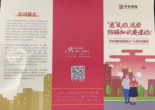 为了全面提升老年人反诈防骗意识,切实维护老年人合法权益,积极落实开展打击整治养老诈骗宣传活动,5月10日,华安财险泰安中支动员所有员工积极转发整治养老诈骗小知识,发放老“友”记宣传折页,提醒广大群众养老诈骗就在身边,在日常生活中加强防范意识,谨防上当受骗。金融诈骗比较常见的套路为:提供虚假养老服务、投资虚假养老项目、销售虚假养老产品、虚假宣称“以房养老”、虚假代办“养老保险”、开展虚假“养老帮扶”、等方式。