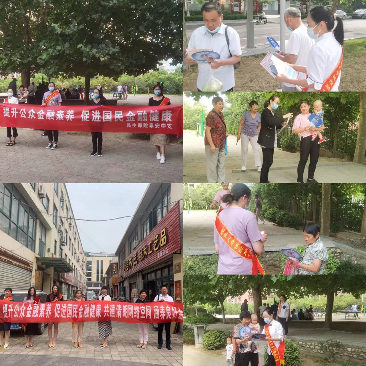 2022年9月,民生保险泰安中支组织人员走进社区、沿街商铺、公园等,悬挂“提升公众金融素养 促进国民金融健康 共建清朗网络空间 涵养良好金融生态”条幅,内勤人员佩戴民生保险字样的绶带走进社区进行现场宣传,向社区居民发放金融知识宣传折页,现场讲解金融知识和保险知识。