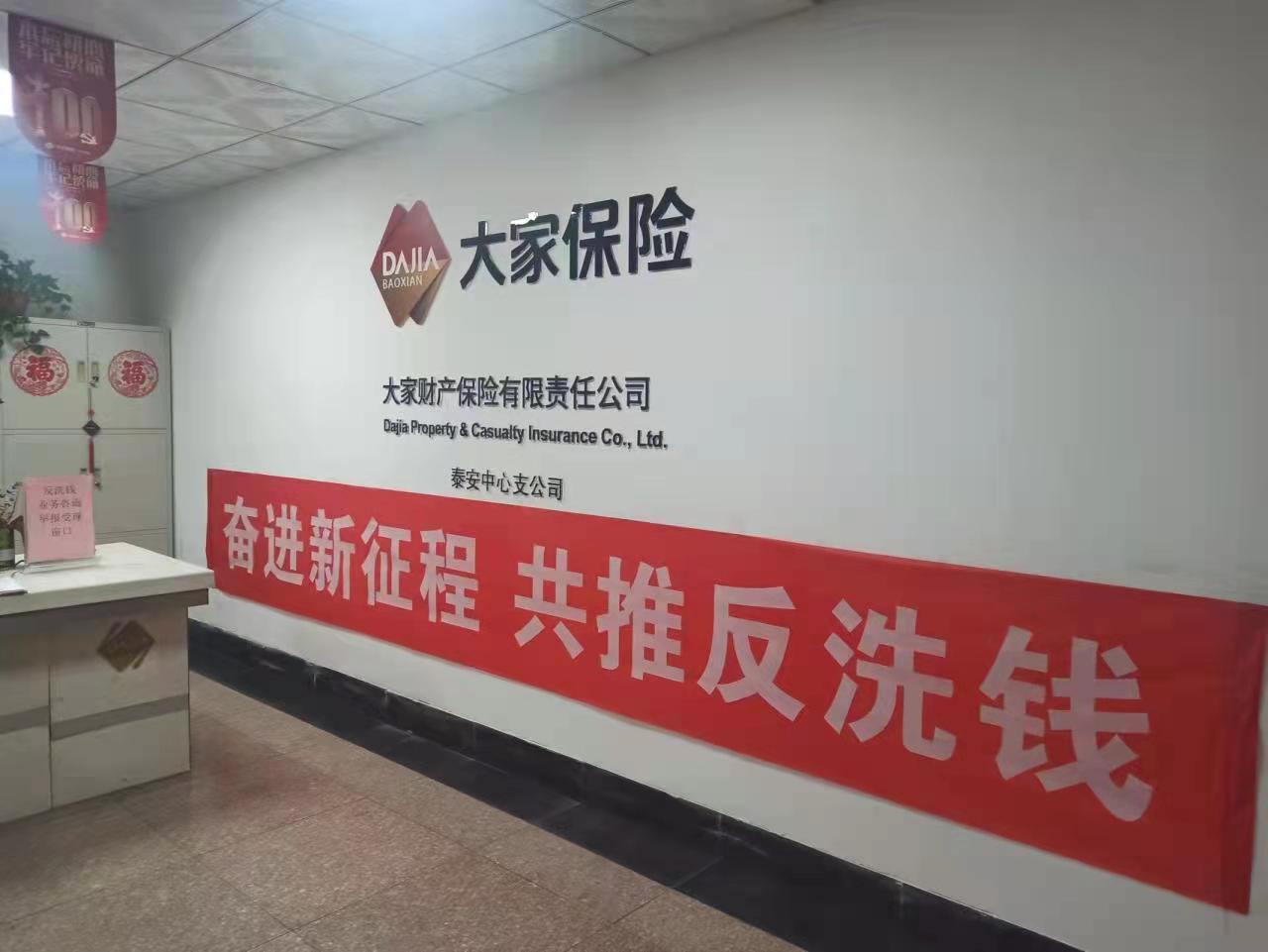 大家财险泰安中支充分利用晨会时间学习活动内容,将工作方案传达到每位员工,确保反洗钱答题活动的有序开展,大家财险泰安中支以职场网点为依托,在营业网点醒目位置悬挂宣传条幅,在公司内部设置公众教育宣传栏,将宣传手册、海报等宣传资料放置在宣传栏以便客户和群众阅读,宣传反洗钱知识。