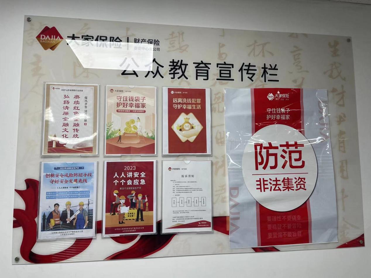 大家财险泰安中支在2023年6月集中开展了以“守住钱袋子·护好幸福家”为主题的防范非法集资宣传月活动,并进行了专项风险排查。