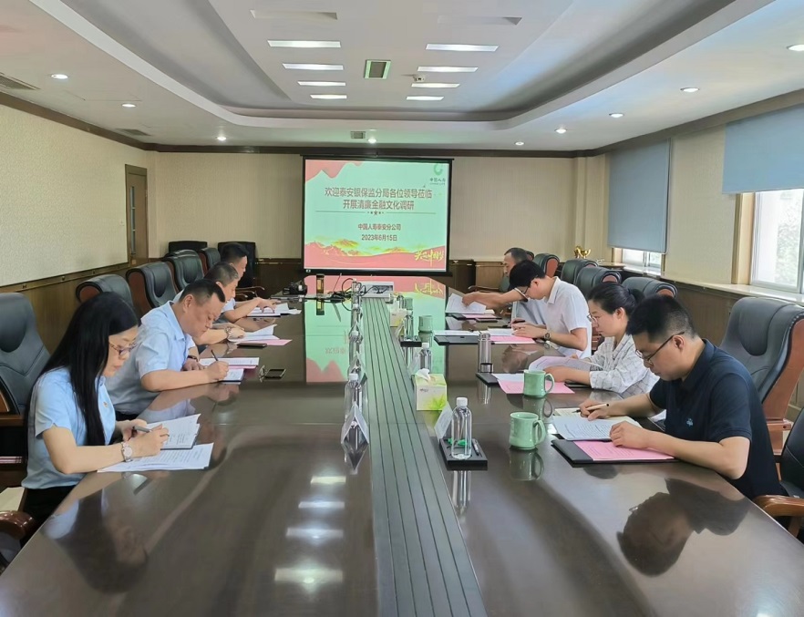 6月15日,泰安银保监分局党委委员、纪委书记杨光一行莅临中国人寿泰安分公司开展清廉金融文化建设专项调研。泰安银保监分局纪委办公室主任张丽娟、泰安市保险行业协会专职副会长刘彬奎、协会副秘书长刘文阁陪同调研。泰安分公司党委书记、总经理赵赛、纪委书记孙军涛、相关部门负责人参加调研。