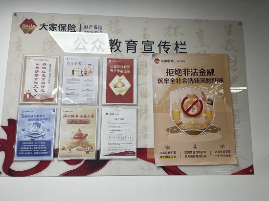 大家财险泰安中支积极发挥营业网点阵地宣传作用,通过在柜台、公众教育区摆放反洗钱相关宣传资料,在职场明显位置张贴活动条幅的方式开展职场内部宣传活动。