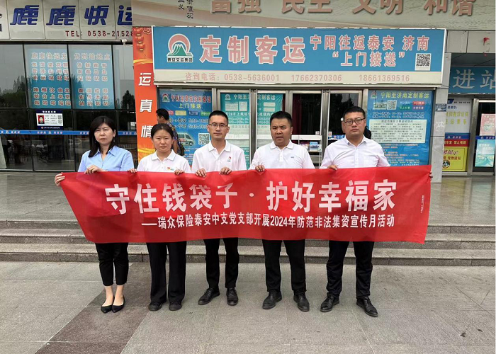 为提高社会公众防范非法集资意识,增强人民群众对非法集资的防范意识和能力,6月14日,瑞众保险泰安中支党支部以“守住钱袋子,护好幸福家”为主题,走进宁阳汽车站开展防范非法集资宣传活动。旨在提高公众对非法集资危害的认识,增强风险防范意识,守护每一个家庭的经济安全与幸福。