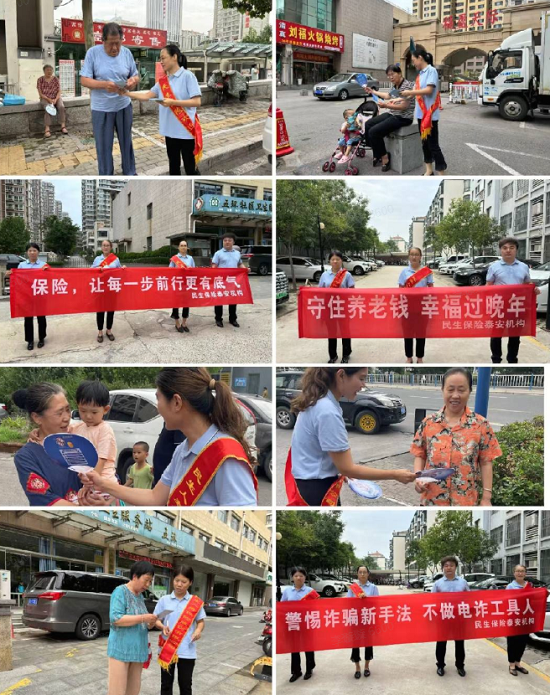 内勤人员走进苹果园社区、货场路商业街、福盈天际社区、五环社区;悬挂“保险,让每一步前行更有底气”、“警惕诈骗新手法 不做电诈工具人”、“守住养老钱 幸福过晚年”的宣传条幅;佩戴民生保险字样的绶带走进社区、商圈进行现场宣传,向社区居民、老年人发放金融知识宣传折页及防范非法集资和金融诈骗等宣传材料。同时向群众宣传保险知识、消费者权益保护、反洗钱、《信访条例》等与消费者权益密切相关的金融知识,达到了保险公众宣传的良好效果。