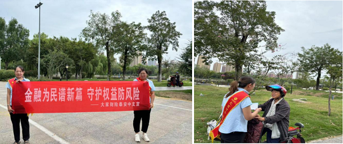 9月13日大家财险泰安中支组织宣传队进社区、进公园,把金融知识带到群众身边,与广大群众一同提高,通过悬挂横幅、发放宣传彩页、现场解答等方式向过往客户宣传和讲解金融知识和金融风险意识,聚焦“一老一少一新”等重点群体,注重帮助老年人、新市民等群体解决数字鸿沟问题,针对年轻人加强过度借贷诱导的风险防范能力构建等方面开展金融服务举措教育宣传。