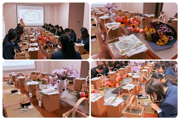 阳春三月,万物萌新。2025年"三八"国际妇女节来临之际,中汇人寿泰安中支精心策划了"巾帼巧手"手工沙龙系列活动,3月7日上午,创意插花工作坊在芬芳馥郁中启幕。素手拈花,巧思成韵,翠绿洋桔梗与香槟蝴蝶兰错落相映,恰似春风裁剪的立体诗行。压花台灯制作环节更显匠心独运,女职工们将风干的樱花、雏菊定格在灯罩之上,当暖黄灯光穿透花瓣纹理,整个空间瞬时流淌着被封印的春光。最受瞩目的当属手工胸针制作,珍珠与珐琅在指尖翩跹起舞,一枚枚别致胸针既承载着现代女性的审美主张,又暗合"柔肩担重任"的巾帼气韵。