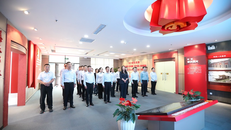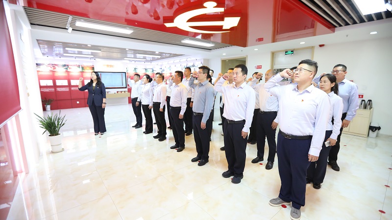 在讲解员引领下参观党章教育厅,通过智能透明触控显示屏和交互式物体识别系统,了解党章的主要内容、功能、地位和作用,增强学习党章、遵守党章、维护党章、贯彻党章的行动自觉。随后,全体党员面向党旗庄严宣誓,铮铮誓言彰显永恒初心。进入党建引领高质量发展“四合”工作服务区,大家积极翻看“四合”服务册,了解金融服务平台的各项功能及政策性优惠信贷产品等相关内容。