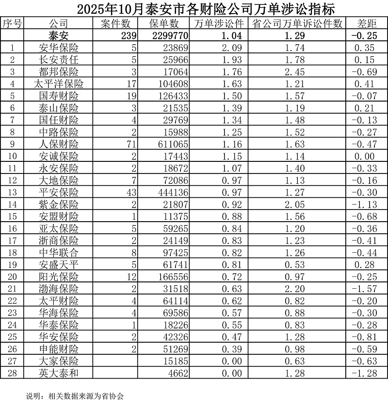 泰安市财险公司车辆保险理赔服务质量测评结果公示(2025年10月)