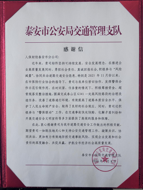 这封感谢信不仅是一份荣誉,更是对人保财险泰安市分公司长期践行企业社会责任、从“风险等量补偿”向“风险主动减量”服务模式转型成果的权威认可。