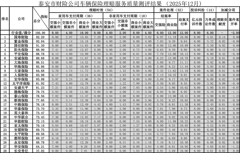 泰安市财险公司车辆保险理赔服务质量测评结果(2025年12月)