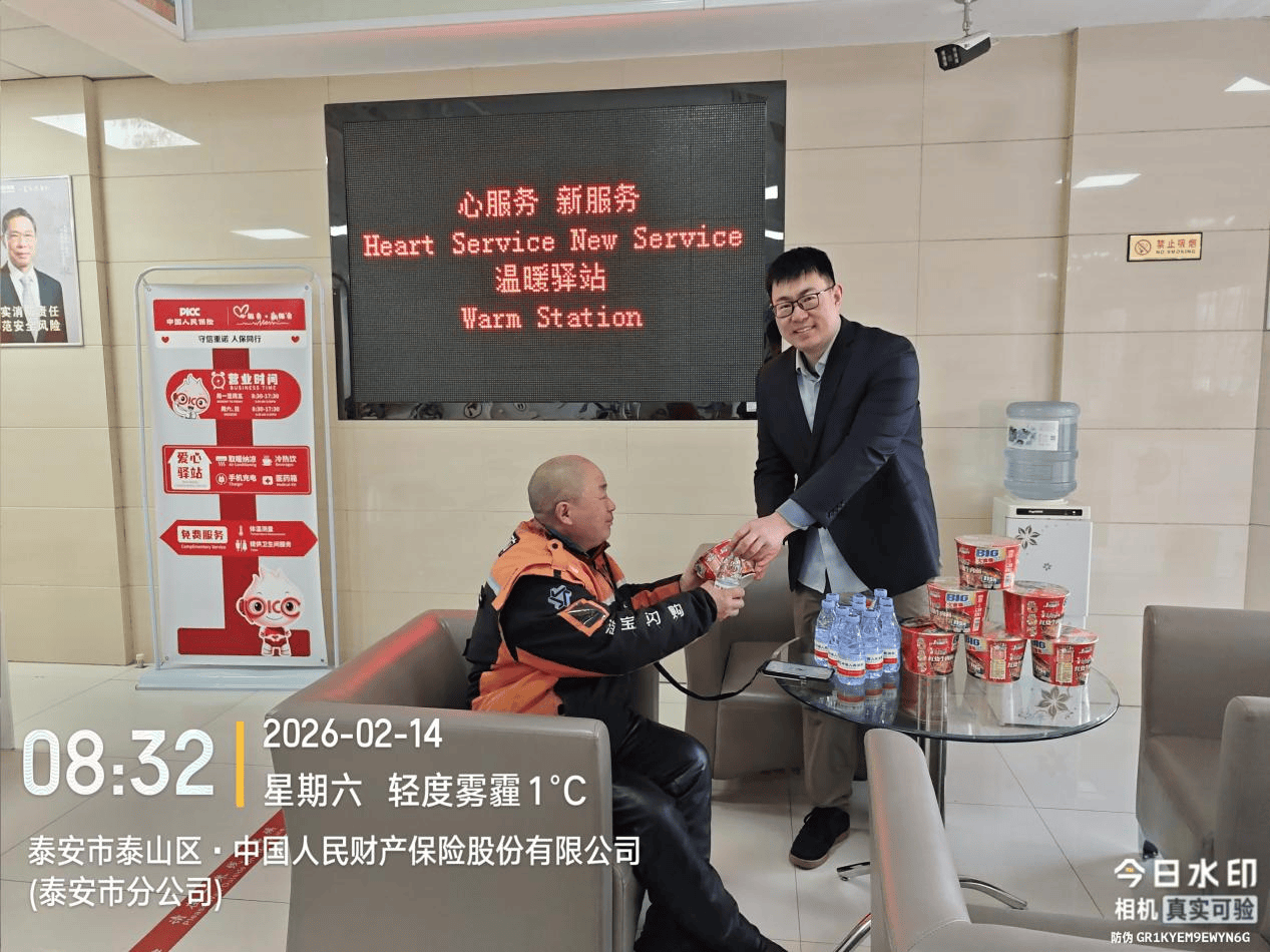 春节将至,年味渐浓。不少外卖骑手、快递员、环卫工人仍坚守在自己的工作岗位、奔波在配送一线,2月14日,该市分公司在营业职场设立“人保能量加油站”,为春节值守的外卖骑手、快递员、环卫工人送上暖心服务与新春祝福。考虑到冬日天冷,工作节奏快,“人保能量加油站”在营业大厅设立专属休息区,精心筹备了矿泉水、方便面等爱心物资,供骑手、快递员、环卫工人免费取用。