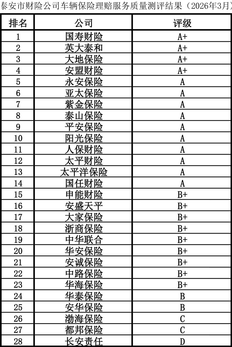 泰安市财险公司车辆保险理赔服务质量测评结果公示(2026年3月)