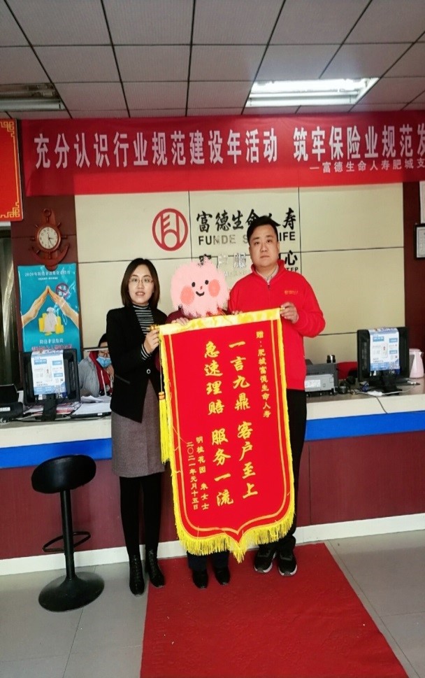 2021年1月18日腊月初六,四九冬季的一天,天气依然寒凉。但在富德生命人寿肥城支公司前台,却因为一位“特殊”来客的到来,而呈现出温暖感动的风景,这位“特殊”来客就是得到保险护佑的朱女士。下午15:00朱女士在优秀的李红梅经理的陪同下,共同来到公司前台送上感谢锦旗,“一言九鼎 客户至上 急速理赔 服务一流”的金字赠语,体现了客户的感激之情。