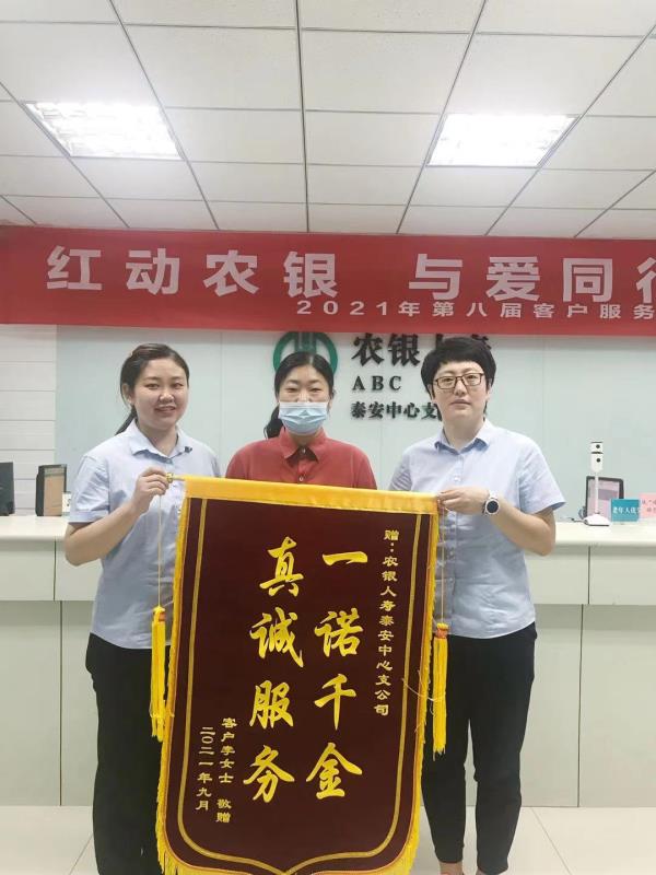 2021年9月9日,客户李女士将一面印有“一诺千金,真诚服务”的锦旗送到了公司客户服务中心。客户李女士2021年8月10日因甲状腺癌住院治疗。公司客服人员在了解情况后,对李女士表达了慰问,并将需要准备的理赔资料告知客户,提醒客户资料齐全后及时提交资料。