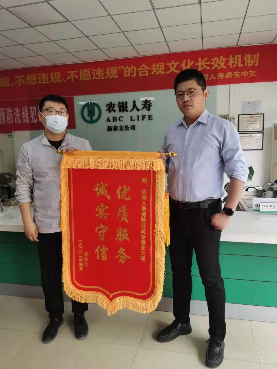 2022年4月10日,客户特意委托服务人员将“优质服务,诚实守信”的锦旗送至公司,对农银人寿新泰支公司表示最真挚的感谢。农银人寿再一次以实际行动赢得了客户信任与尊重。