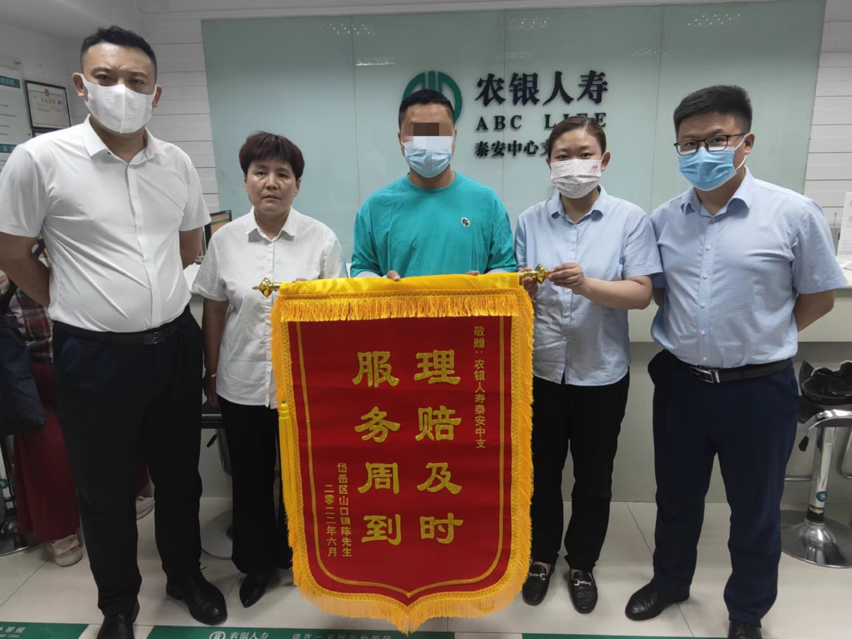 2022年端午节刚过,客户C先生的家人将印有“理赔及时,服务周到”的大红锦旗送到农银人寿泰安中支工作人员手中,以表达对农银人寿的满心感激之情。