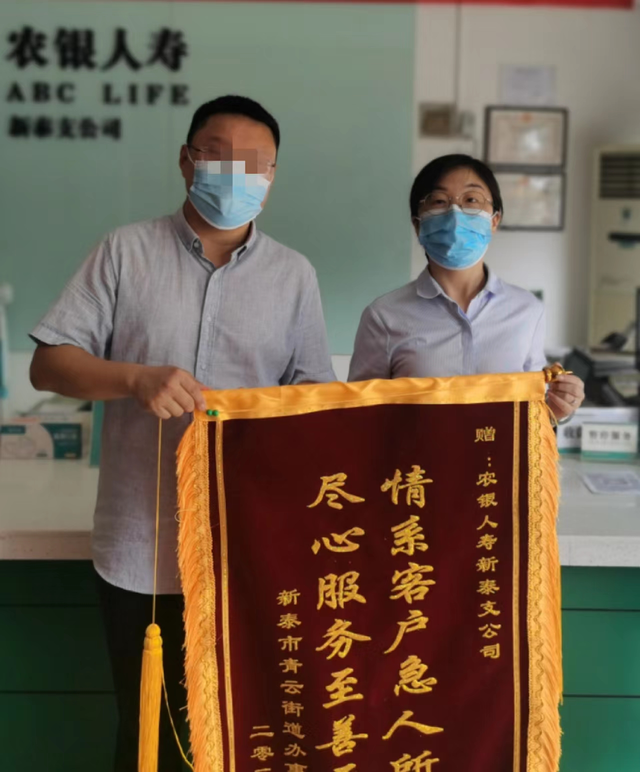 8月的天气依然炎热,客户Y女士的家人冒着酷暑来到农银人寿新泰支公司,将一面绣有“情系客户急人所急,尽心服务至善至美”的锦旗送到工作人员的手中,以此表达对农银人寿高效理赔和优质服务的感谢。