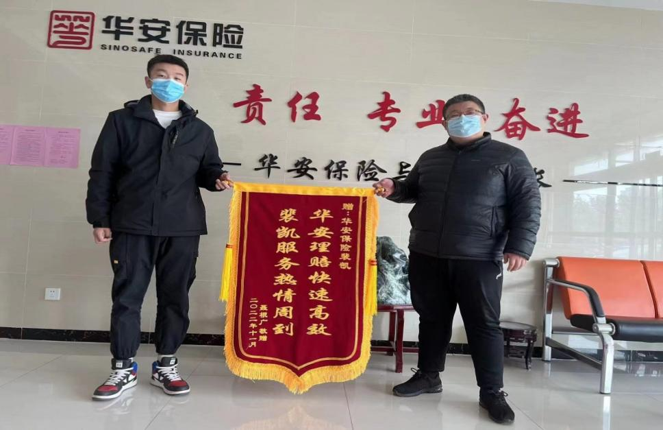 2022年12月2日,客户聂先生将一面印有“华安理赔快速高效、裴凯服务热情周到”的锦旗赠予山东泰安中心支公司。