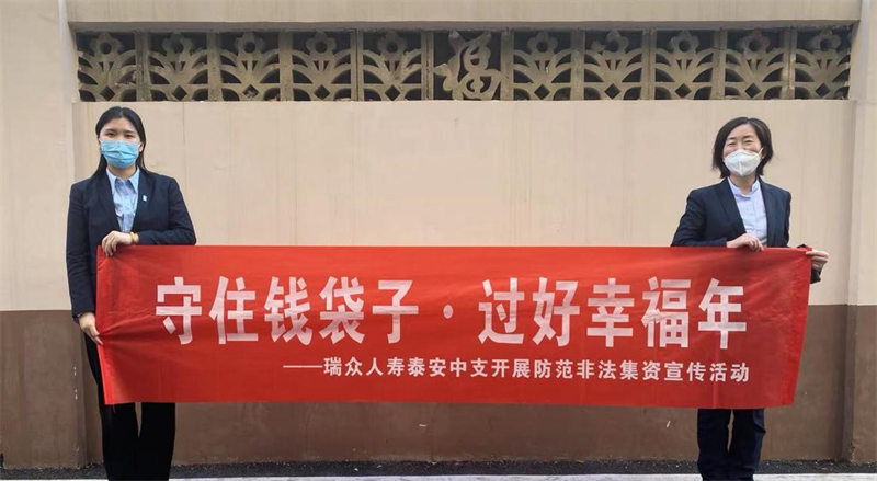 瑞众人寿泰安中支还通过多种多样的形式向客户及驻地居民开展防范非法集资宣传活动,组织从业人员集中学习防范非法集资知识,并在营业大厅滚动播放防范非法集资宣传主题。