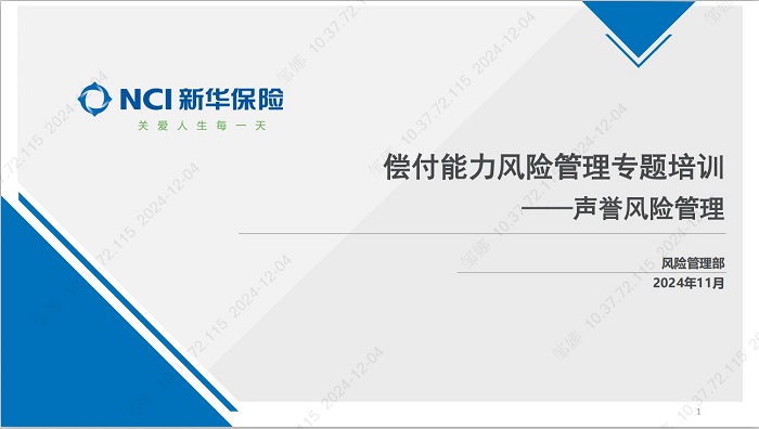 11月28-30日,新华保险泰安中心支公司开展声誉风险管理培训工作,要求全员开展《2024年偿付能力风险管理专题培训——声誉风险管理培训》,普及知识、强化理念,以实现对声誉风险早识别、早预警、早处置,牢固树立全员声誉风险防范意识与底线思维,筑牢公司安全发展根基,护航公司高质量发展。