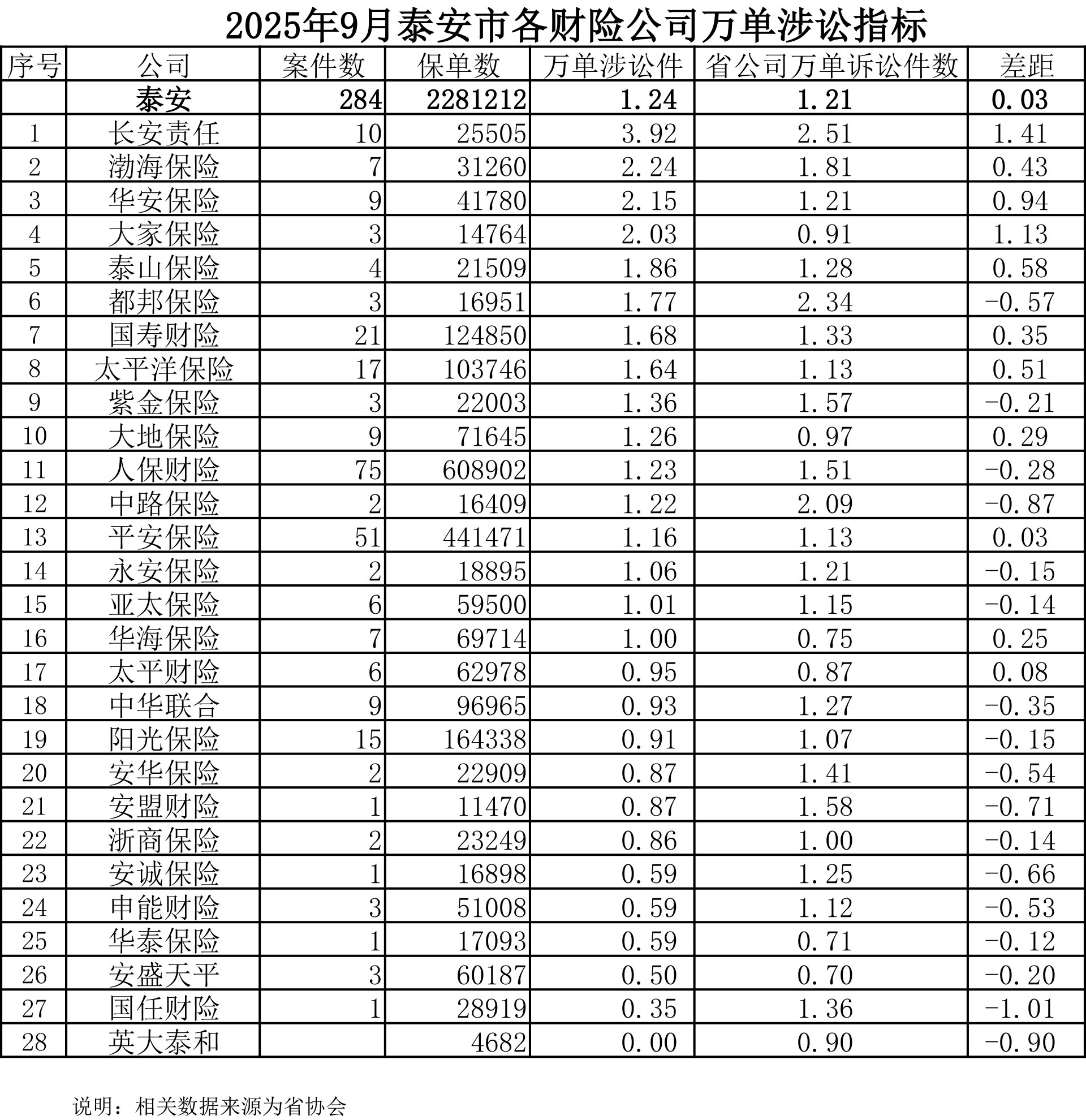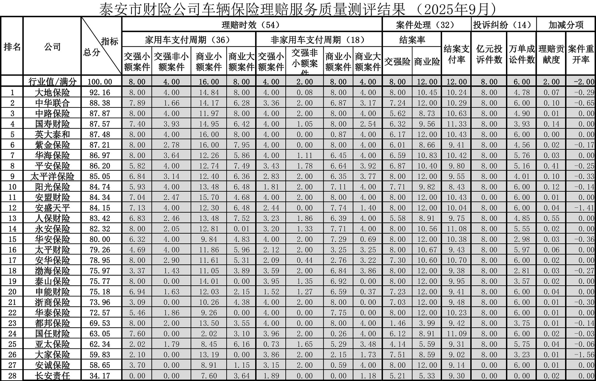 泰安市财险公司车辆保险理赔服务质量测评结果公示(2025年9月)