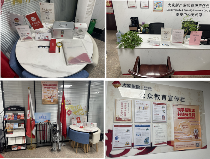 走进大家财险泰安中支服务网点,便民设施一应俱全:设置有“暖心驿站”,免费休息区、免费饮水、免费充电等便民服务随时待命;职场内部有电子屏,循环播放消保、金融知识相关宣传视频,职场设有客户服务专区,专区内配置轮椅、血压计、拐杖、老花镜、放大镜、雨伞、应急药箱等辅助设备,摆放了宣传材料展架,展示宣传资料,供到访的客户阅读,普及金融知识、消保、安全等知识,倾听消费者的意见和建议;针对残障人士,提供盲文版业务指南及金融知识普及类宣传手册,针对外国人,提供新版外国人永居证服务指南、《外国商务人士在华工作生活指引》及其他教育宣传材料,为特殊人群办理相关业务提供个性化服务;为了让老年人共享科技成果,提升老年人对智能化应用的操作能力,特别制作老年人智能手机应用手册,方便老年客户学习操作。同时完善老年人服务设施,设置老年人专属服务台和爱心专座,为上门办理业务的老年人客户提供专享的服务用品,体现公司适老化服务的关怀。