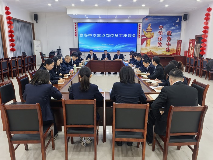 11月5日,中华财险泰安中支召开重点岗位人员座谈会,中支班子成员、各部门负责人、各部门骨干共计20余人参加座谈。