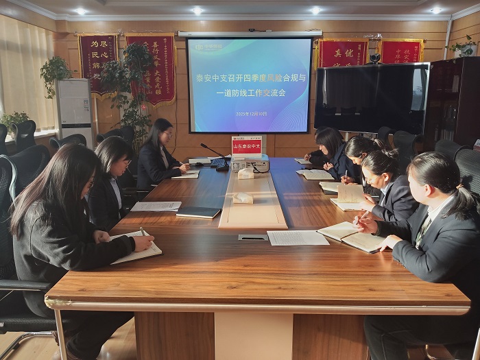 12月10日,中华财险泰安中支召开风险合规与一道防线集中交流会。人事行政部(党群工作部)、财务会计部、个人客户发展部/客服运营部负责人及合规专兼岗参加了会议。
