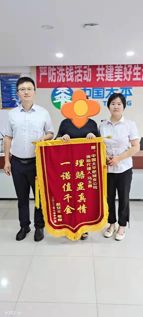 近日,泰安肥城的赵女士来到太平人寿肥城支公司的客服大厅,送上了一面写有“一诺值千金,理赔显真情”字样的锦旗。